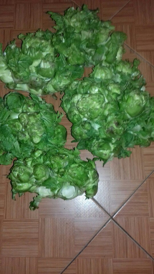 Ruộng cải mầm đá đang giai đoạn chuẩn bị rụng lá ra mầm. Từ những cây cải to cao đồ sộ, bằng kĩ thuật can thiệp đơn giản, chẳng mấy chốc từ thân cây sẽ mọc ra những mầm cây béo mập, mũm mĩm