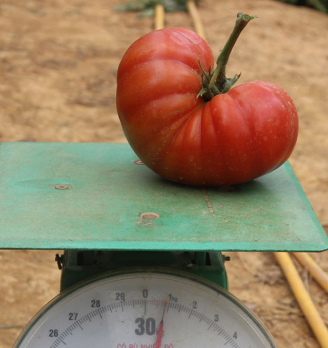 Đây là cà chua Beef cao cấp, thường được dùng kèm với các loại thức ăn nhanh. Điểm đặc biệt của giống này là trái nặng từ 600 g đến 1 kg,trong khi cà chua mà đa số nông dân trồng phải 15-20 quả mới được một kg. cà chua khổng lồ đã trồng thành công ở nước ta