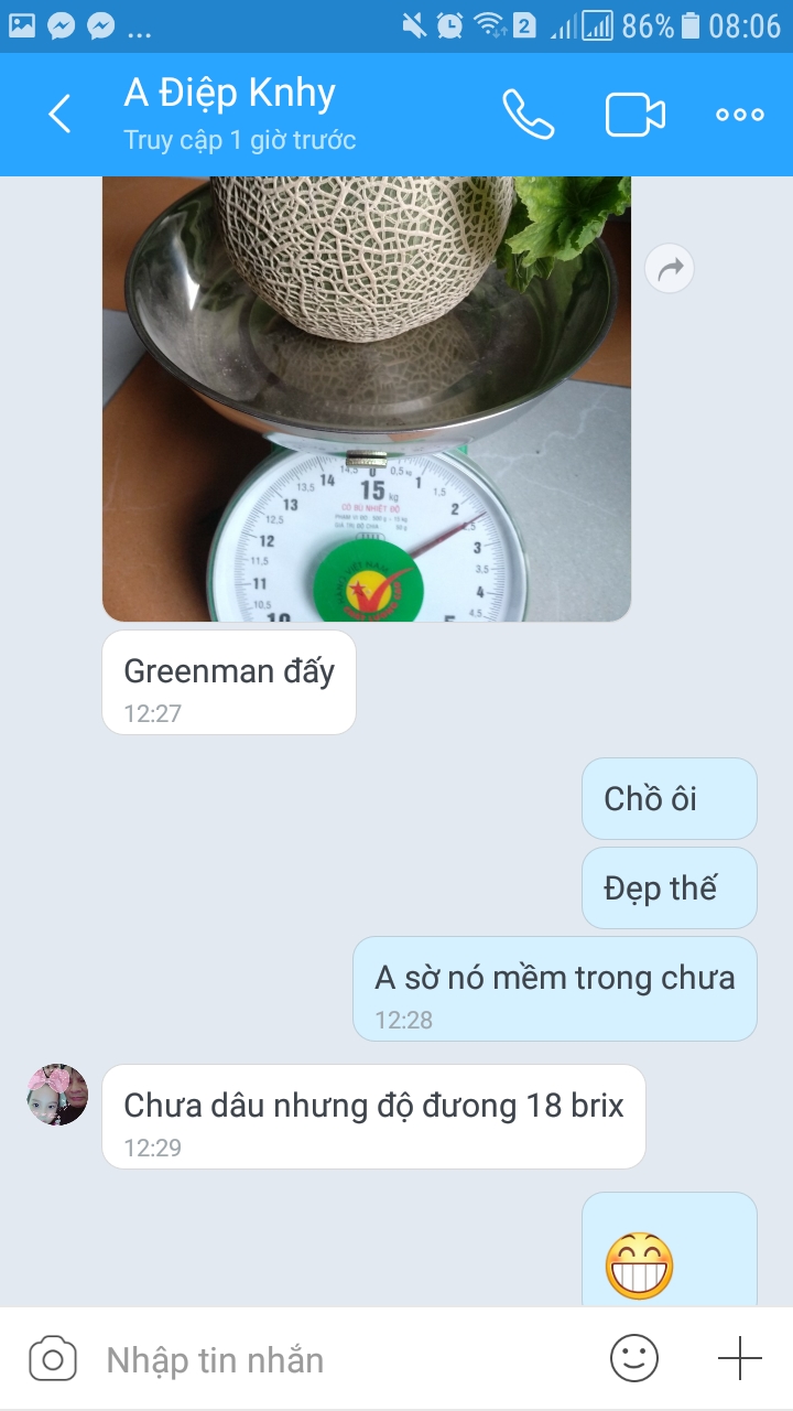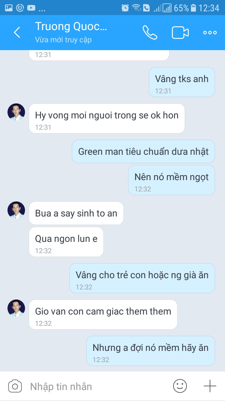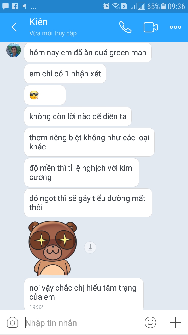 Em chuyên bán giống cho nhà vườn chuyên nghiệp nên quen nhiều nhà vườn, Có anh nhà vườn thân thiết gửi cho 6 quả green man và 10 quả ruột cam. Riêng thằng green man này em háo hức lắm vì bình thường toàn ăn ruột cam, hiếm khi được ăn ruột xanh. 1 quả đầu ko biết nó vẫn xanh bổ ra cứng quèo , vẫn ngọt sắc nhưng bỏ vỏ đi nhiều quá. Mấy quả kia để sau 1 tuần khi sờ tay nắn vào bên trong thấy mềm trời ơi mềm và ngọt quá. Ông con gặm phát hết 4.5 miếng cỡ 1/5 quả đến độ bụng lặc lè. Ối giời ơi mẹ hét ầm lên bảo chồng đấy đấy nó ăn rồi kìa. Chồng em chẳng nói chẳng rằng mỉm cười thung thướng bảo . Không phải nó biếng ăn mà thằng này sành. Phải ngon mới ăn...